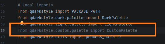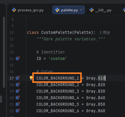 COLOR_BACKGROUND_1对应的变量就是当前主题中的调色板文件中定义的颜色,如果当前主题是custom,它的专属调色板文件:QDarkStyleSheet-master/qdarkstyle/custom/palette.py中COLOR_BACKGROUND_1就对应了一个颜色:Gray.B10