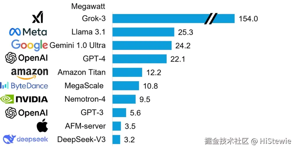 运行成本 :ChatGPT 每天响应用户的提问,大约消耗 50 万度电。相比之下,传统的 Google 搜索一次只消耗 0.3 瓦时,而一次 AI 对话的能耗是它的 10 倍到 30 倍。
