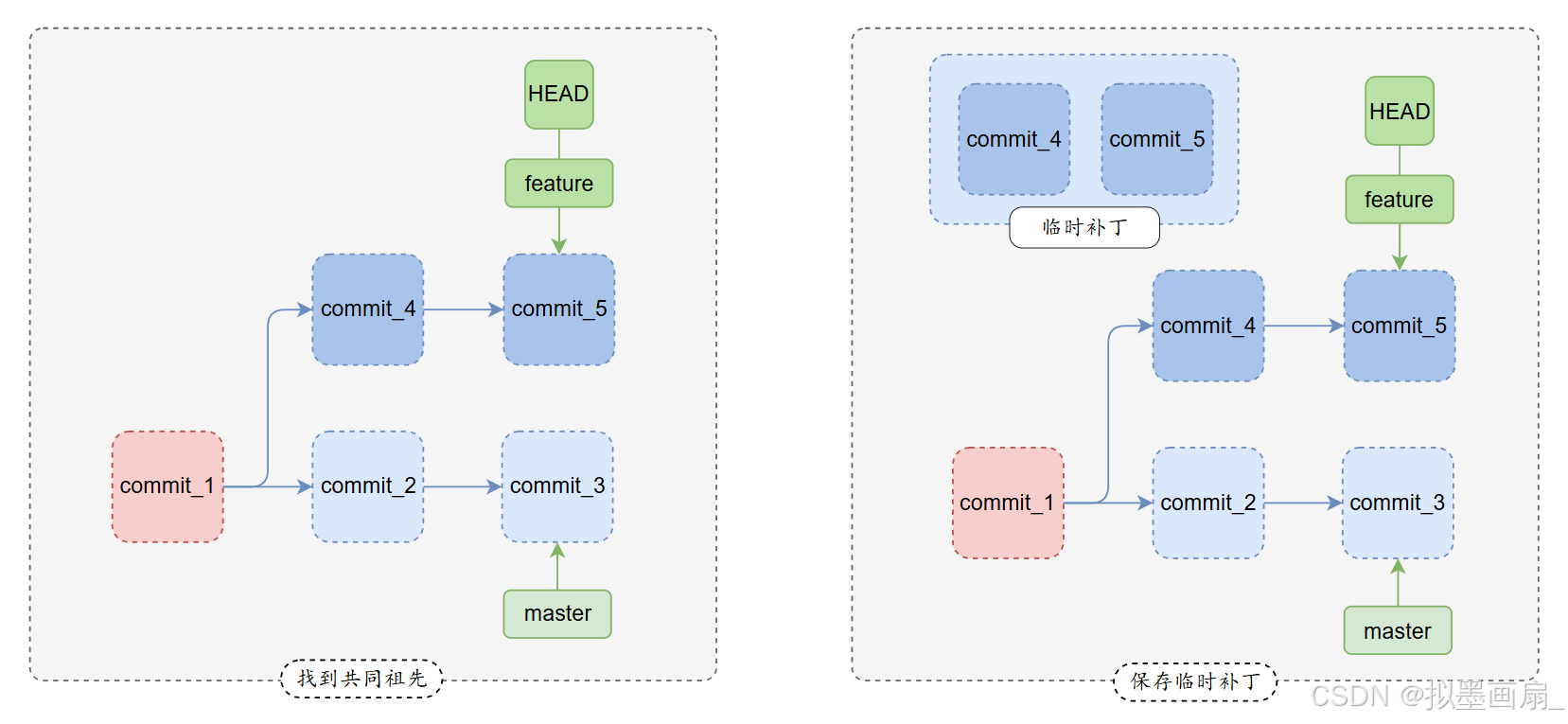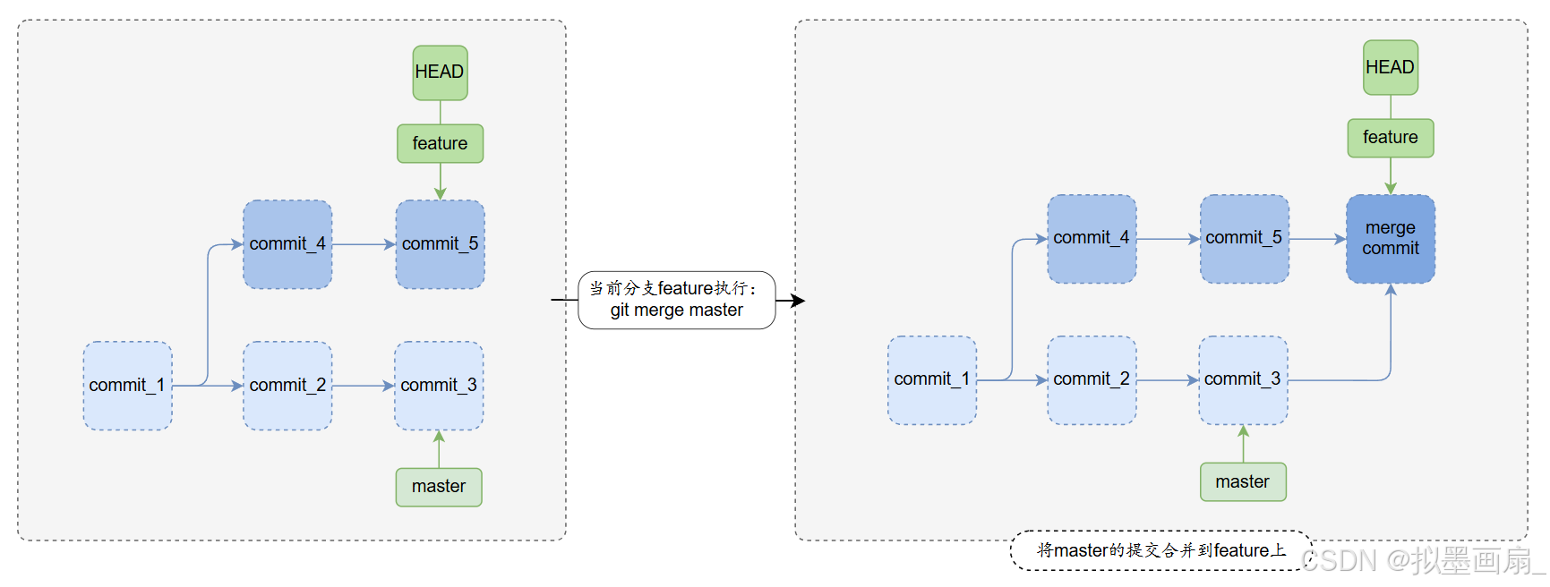 feature执行git merge master,将master的提交合并到feature上,生成合并提交,保留历史