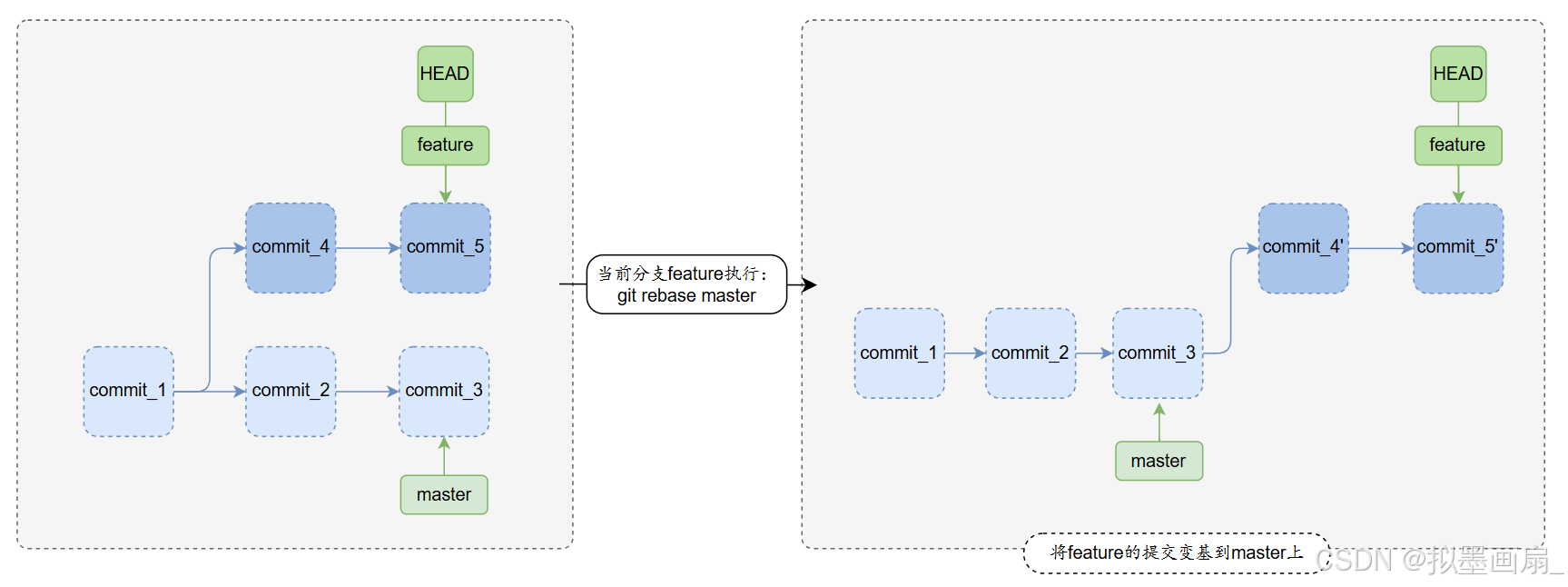 master分支与feature分支均有提交,HEAD当前分支在feature,此时执行指令:shellgit rebase master # feature分支上执行,将当前分支feature变基到目标分支master上