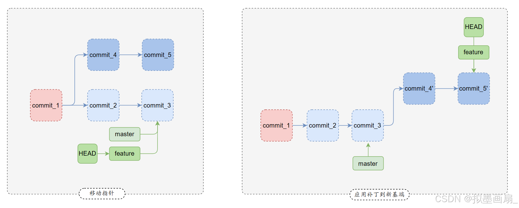 shell# 初始状态 A---B---C (master) \ D---E (feature) # 执行 git rebase master 后 A---B---C (master) \ D'---E' (feature)