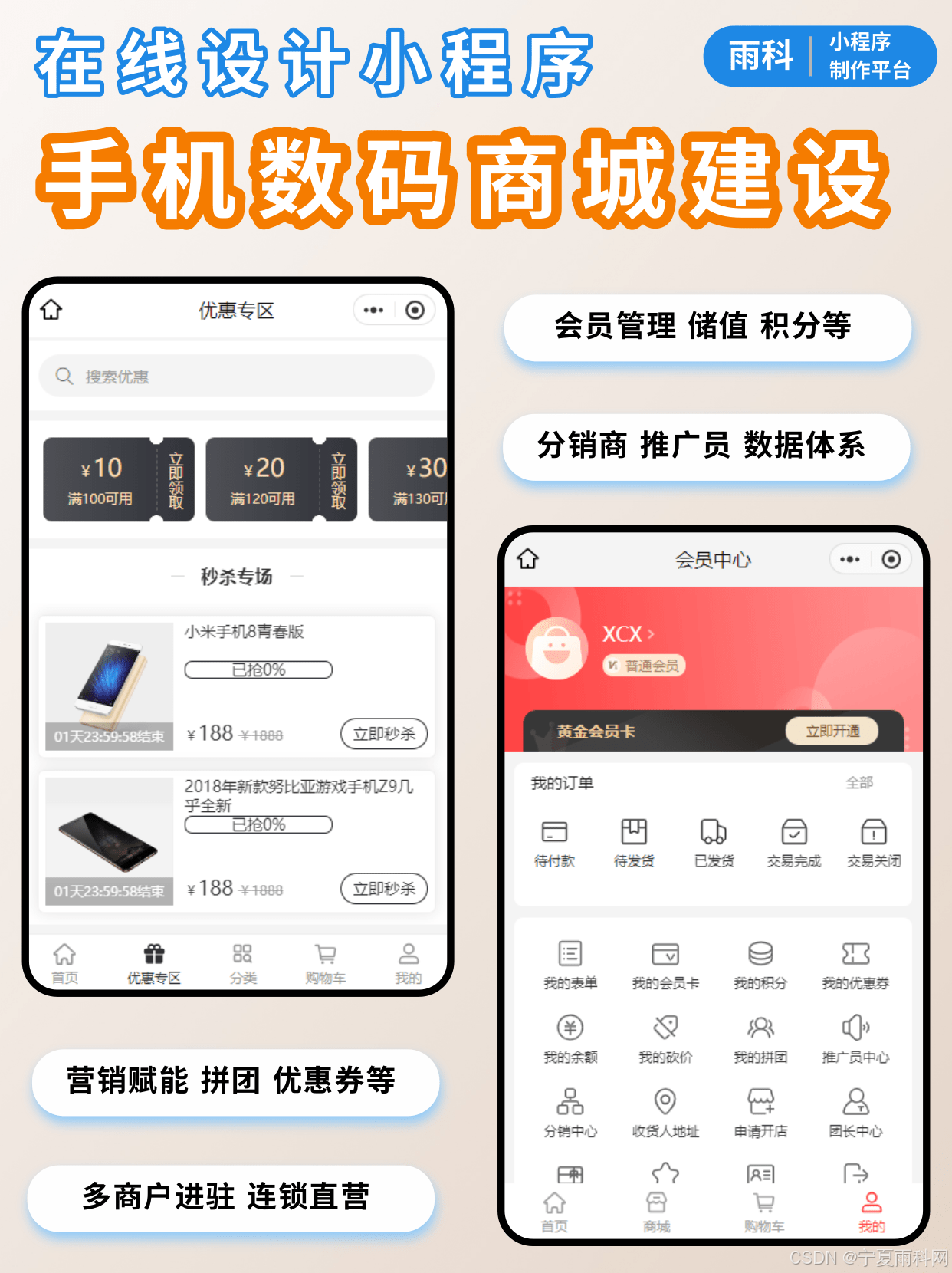 客户会员化管理、储值、积分、等级、分组、会员卡; 分销商、推广员; 多种营销模式,拼团、优惠券、新人礼、礼品卡、组合套餐、短视频、积分商城等;