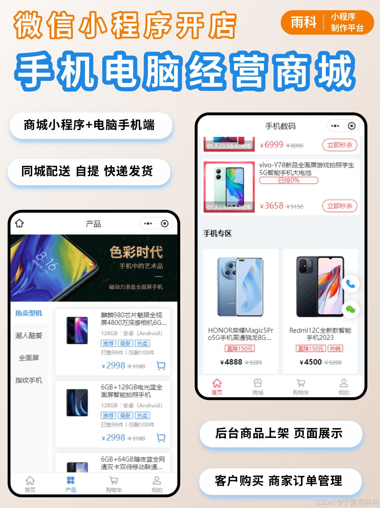 后台手机数码货品全信息上架,小程序页面三级分类展示; 客户随时消费同城配送/自提/快递; 商家订单、数据管理,零售批发模式;