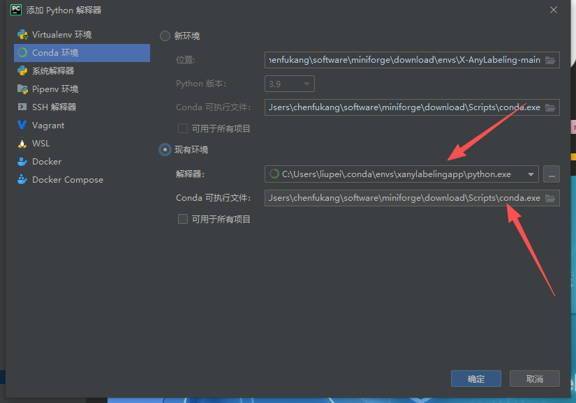添加解释器,选择你刚刚创建的环境即可