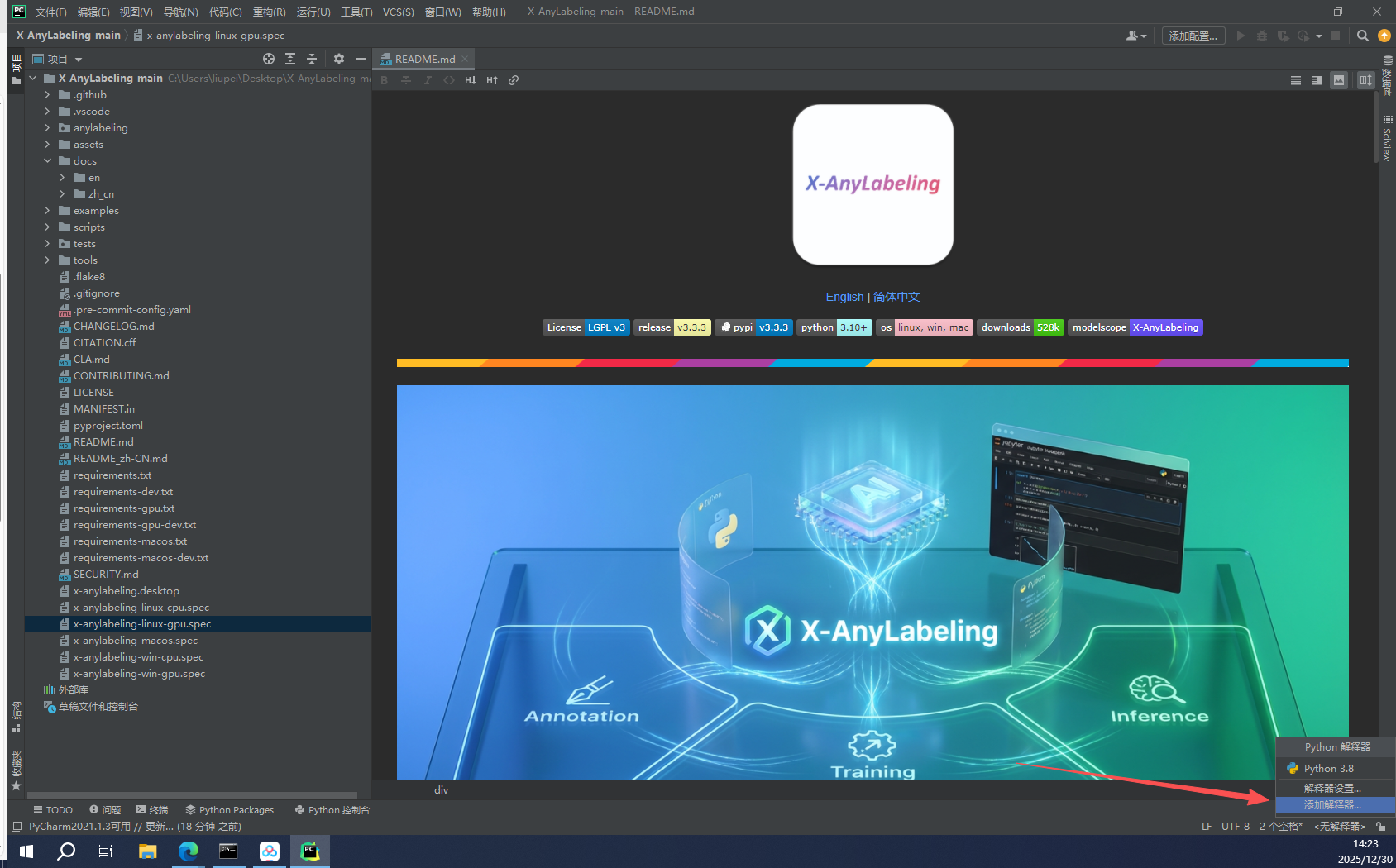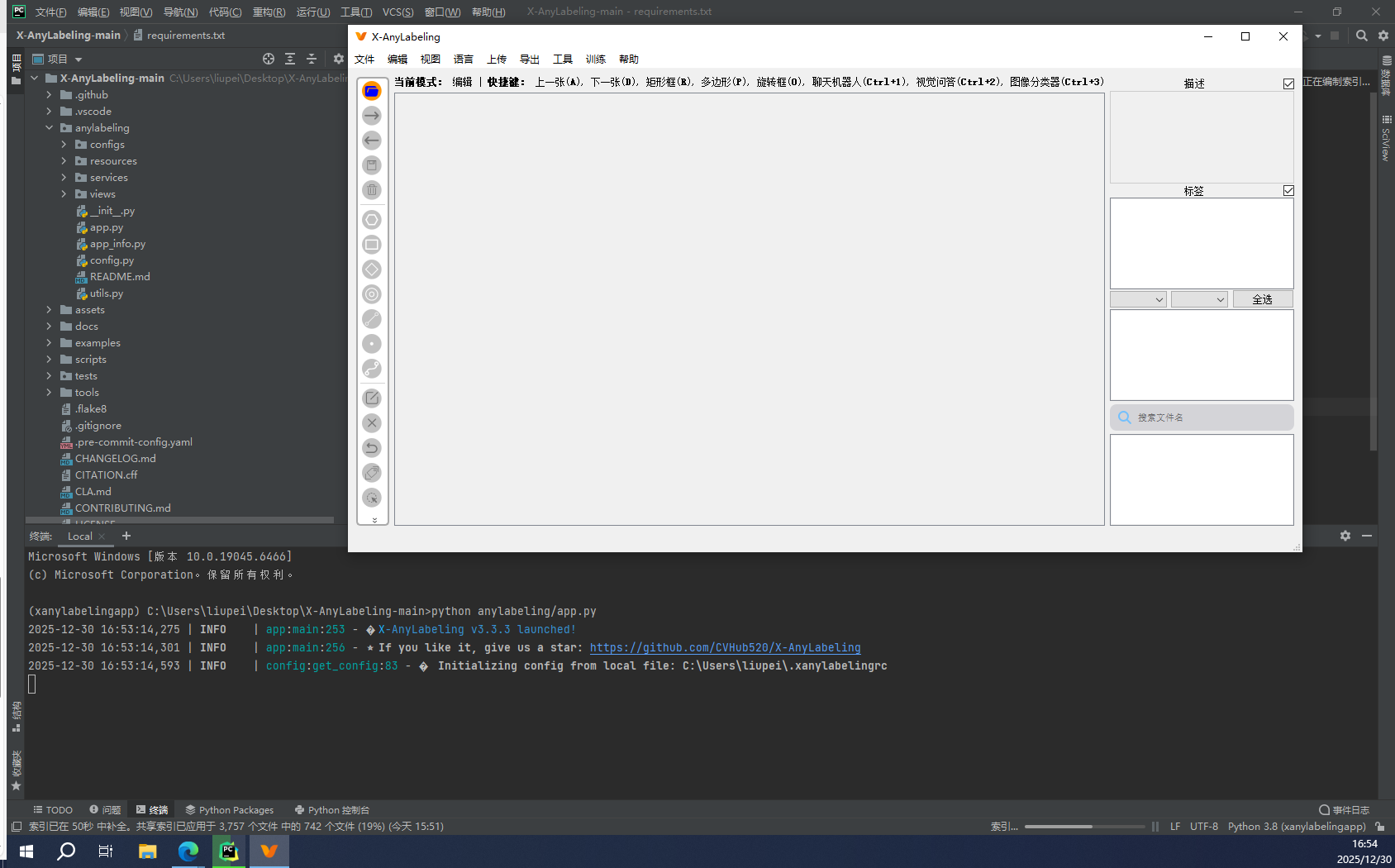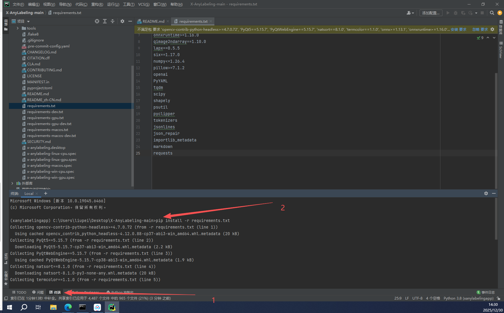 点击终端,安装requirements.txt(或者win+r +》cmd 激活对应的conda环境,然后直接cd C:\Users\liupei\Desktop\X-AnyLabeling-main)