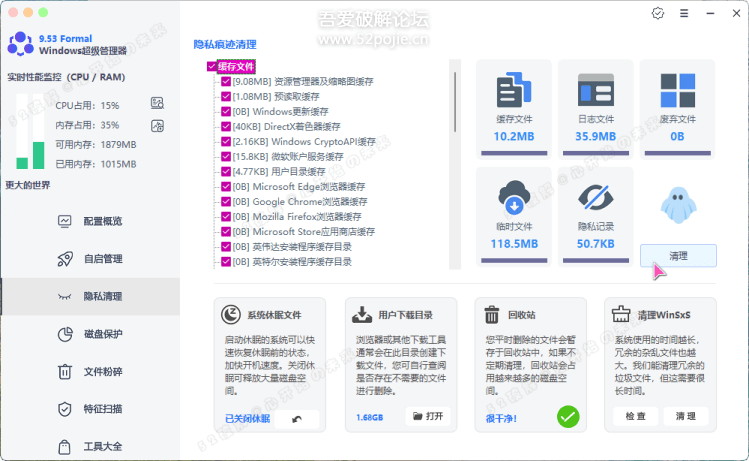 Windows\] Windows 超级管理器 v9.53 链接:[https://pan.xunlei.com/s/VOhj-DR5hX5FBnFYoJBGvUdDA1?pwd=a9tg#](https://pan.xunlei.com/s/VOhj-DR5hX5FBnFYoJBGvUdDA1?pwd=a9tg# "https://pan.xunlei.com/s/VOhj-DR5hX5FBnFYoJBGvUdDA1?pwd=a9tg#")  一款免费无广且功能强大的系统管理软件。其采用 易语言 开发,提供了全面的系统检测包括硬件信息概览/实时监控、垃圾和隐私清理、启动项管理及文件粉碎等功能,可高效地查看及了解计算机参数配置;同时附带多个实用的工具功能,算是开发者、电脑小白管理系统的最佳利器。