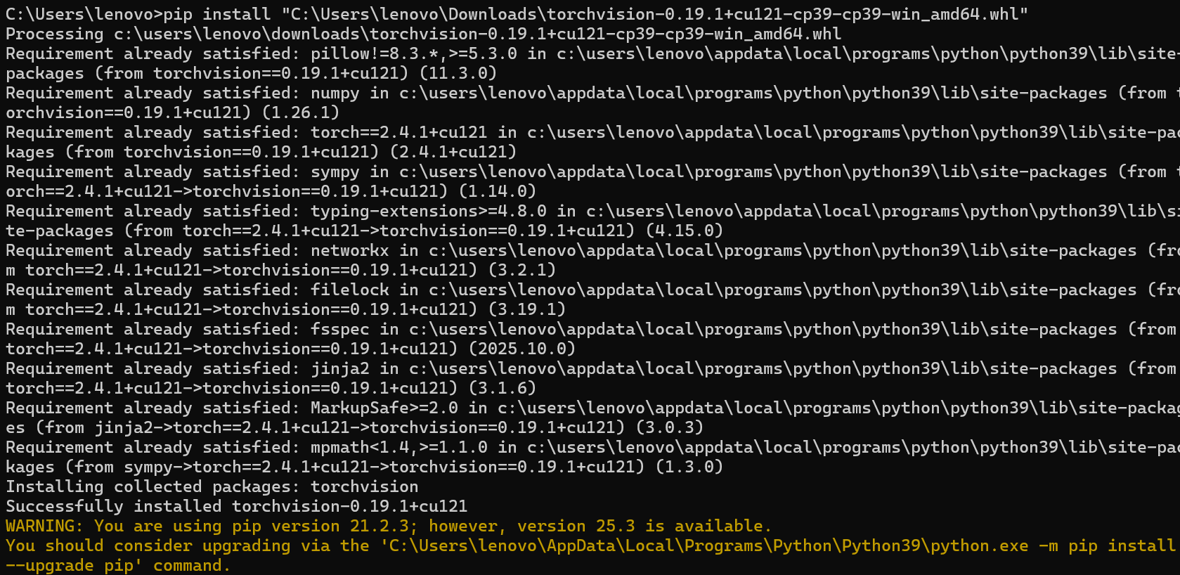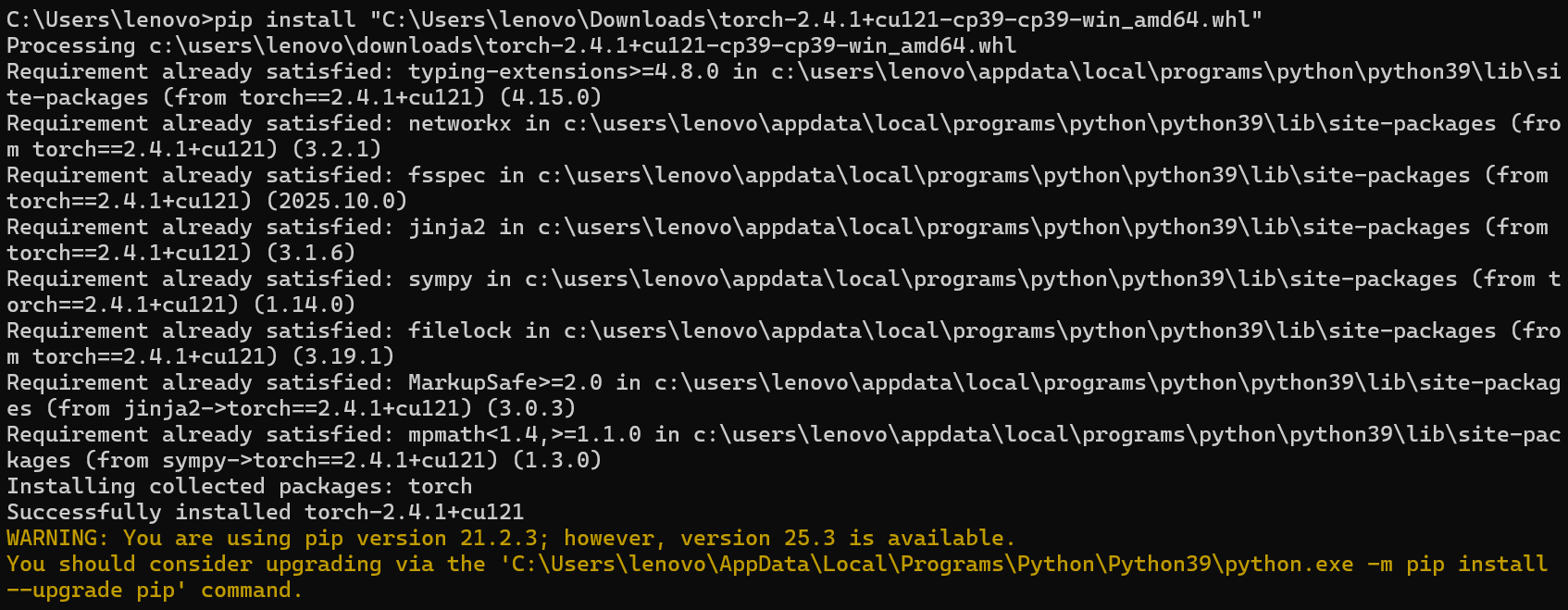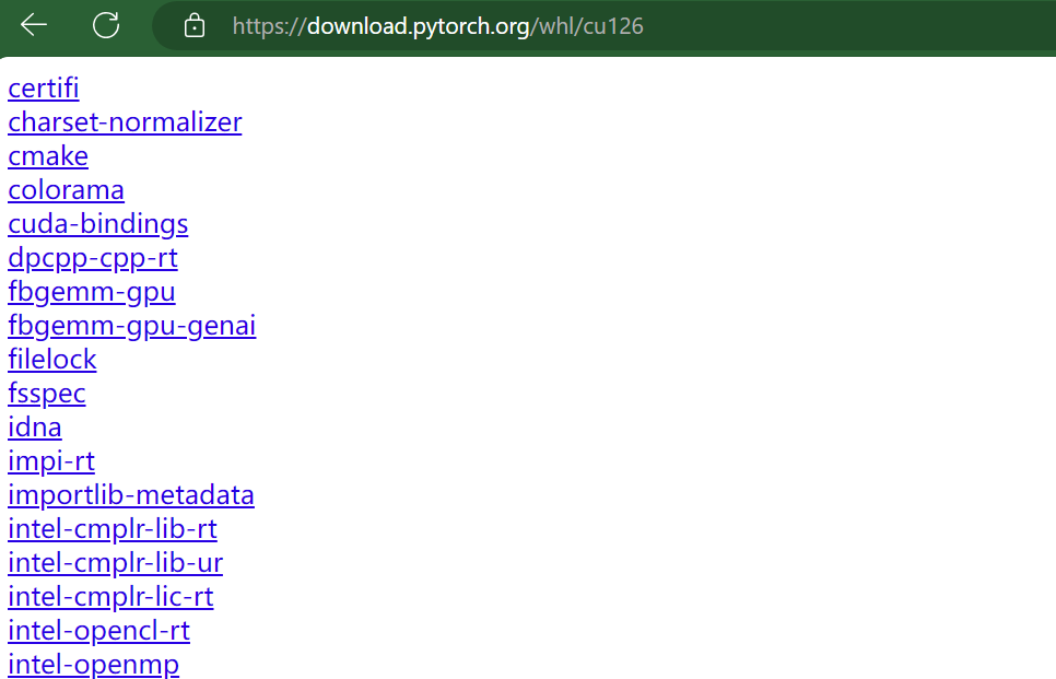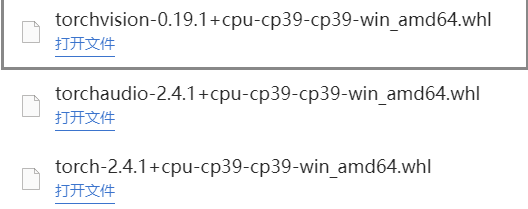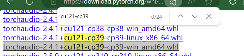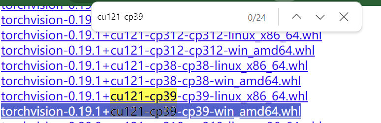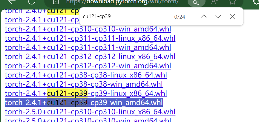选择适合自己的版本,cu121是cuda版本12.1的意思,cp39是python3.9,win是windows系统,如果是使用cpu,就下载cpu版本就好,在该网页按ctrl+f键可以搜索你想要的版本