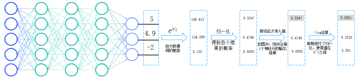 输出层得到原始分数,使用softmax进行归一化概率,取真实类别概率的-log作为损失,为什么用-log,概率越接近1,损失越接近0,概率越低,损失越大。