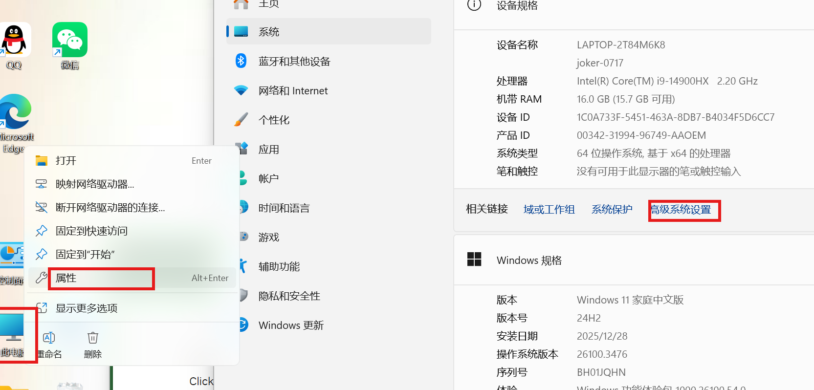 右击此电脑,点击属性,弹窗后点击高级系统设置,新窗口中点击环境变量