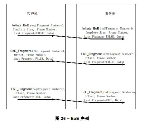 如果要被传输的以太网帧大于 Initiate EoE 服务的 data 参数,则在 Initiate EoE 服务后,使用 EoE Fragment 服务来传输以太网帧的若干分段。表 26 给出 EoE Fragment 服务的服务原语和参数。