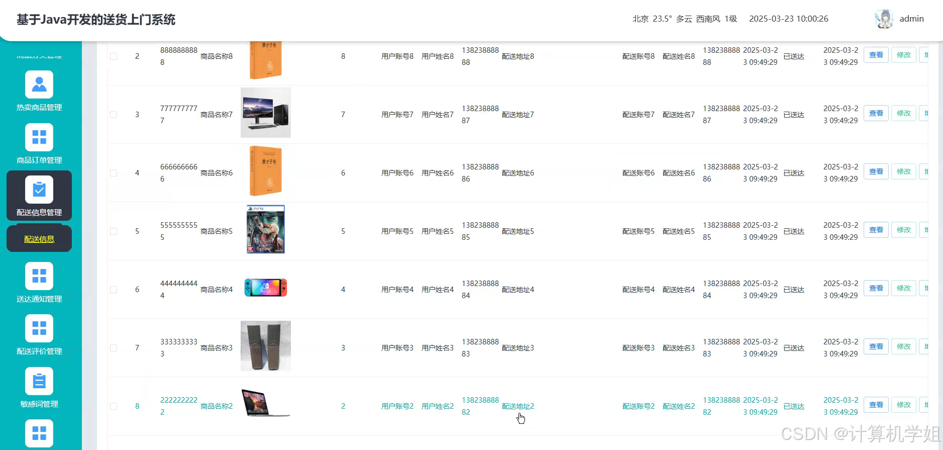 本研究旨在设计并实现一个基于SpringBoot+VUE+MYSQL的送货上门系统,解决传统配送模式中存在的信息传递效率低、流程冗余、用户体验差等问题。系统通过整合前端交互、后端服务与数据库管理三大核心模块,构建一个覆盖用户下单、商家接单、配送员执行、状态反馈的全流程数字化平台。具体目标包括:一是优化用户体验,通过实时订单跟踪、配送进度可视化等功能,减少用户等待焦虑,提升服务透明度;二是提升企业运营效率,利用自动化调度算法与数据驱动的决策支持,降低人工干预成本,缩短配送周期;三是探索低成本技术方案,通过SpringBoot的快速开发特性与MYSQL的稳定性能,为中小型物流企业提供可负担的数字化工具;四是验证技术栈的适配性,通过实际场景测试,评估前后端分离架构在配送系统中的性能表现与扩展潜力。研究预期成果包括一套完整的系统代码、部署文档及性能测试报告,为物流行业数字化转型提供技术实践参考,同时为后续研究在路径优化算法、多端协同机制等方向上的深化提供基础数据与实验平台。