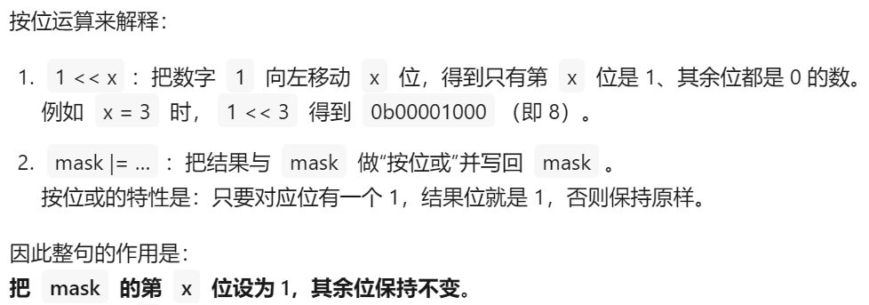 mask|=1<<x; //把mask的第x位设为1