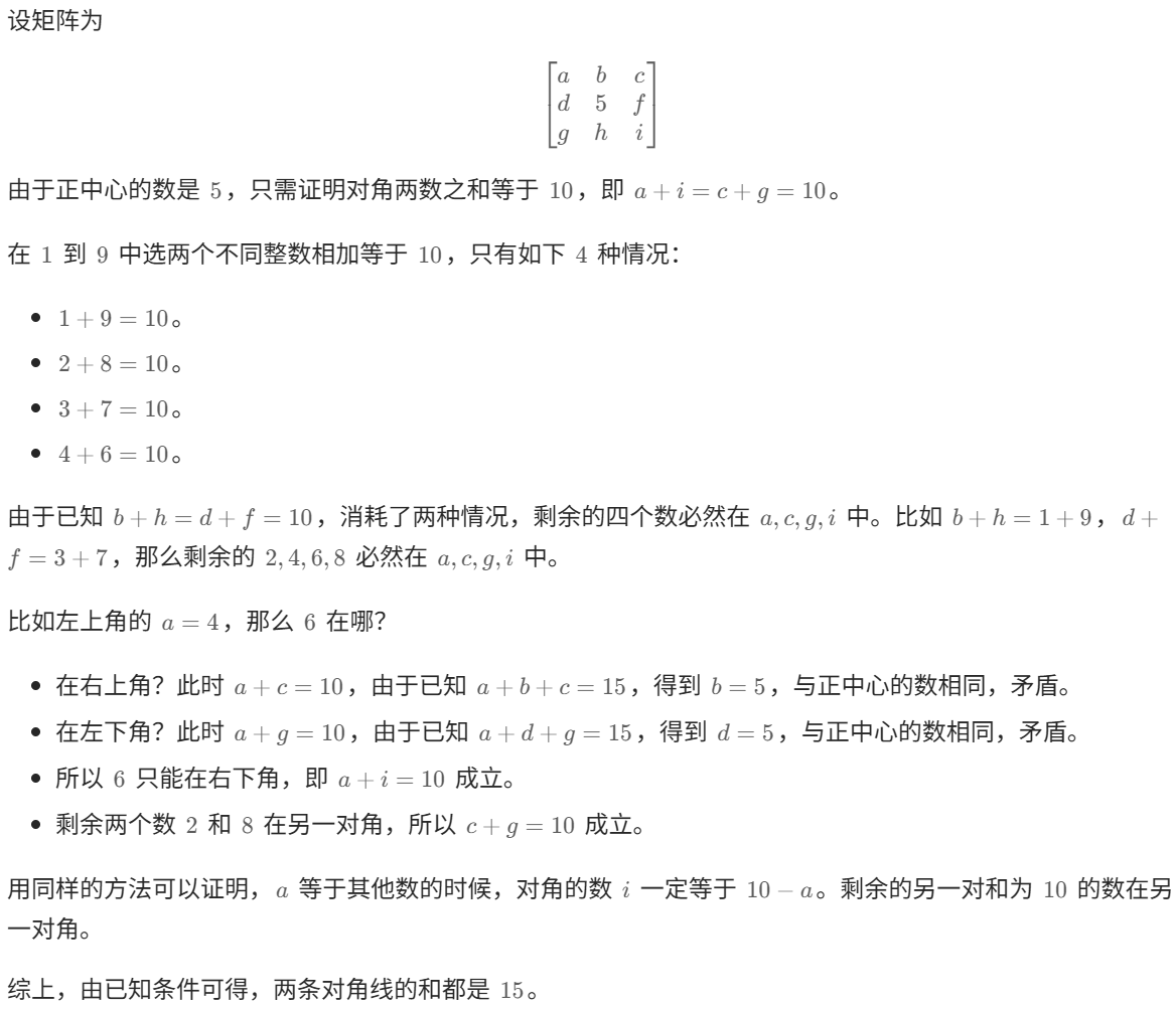 下面证明:矩阵对角线的和一定都是 15。