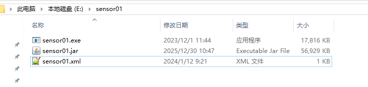3、把下载的WinSW-x64.exe放到和jar包同一个目录下,并更名为sensor01.exe,同时创建一个同名的配置文件sensor01.xml
