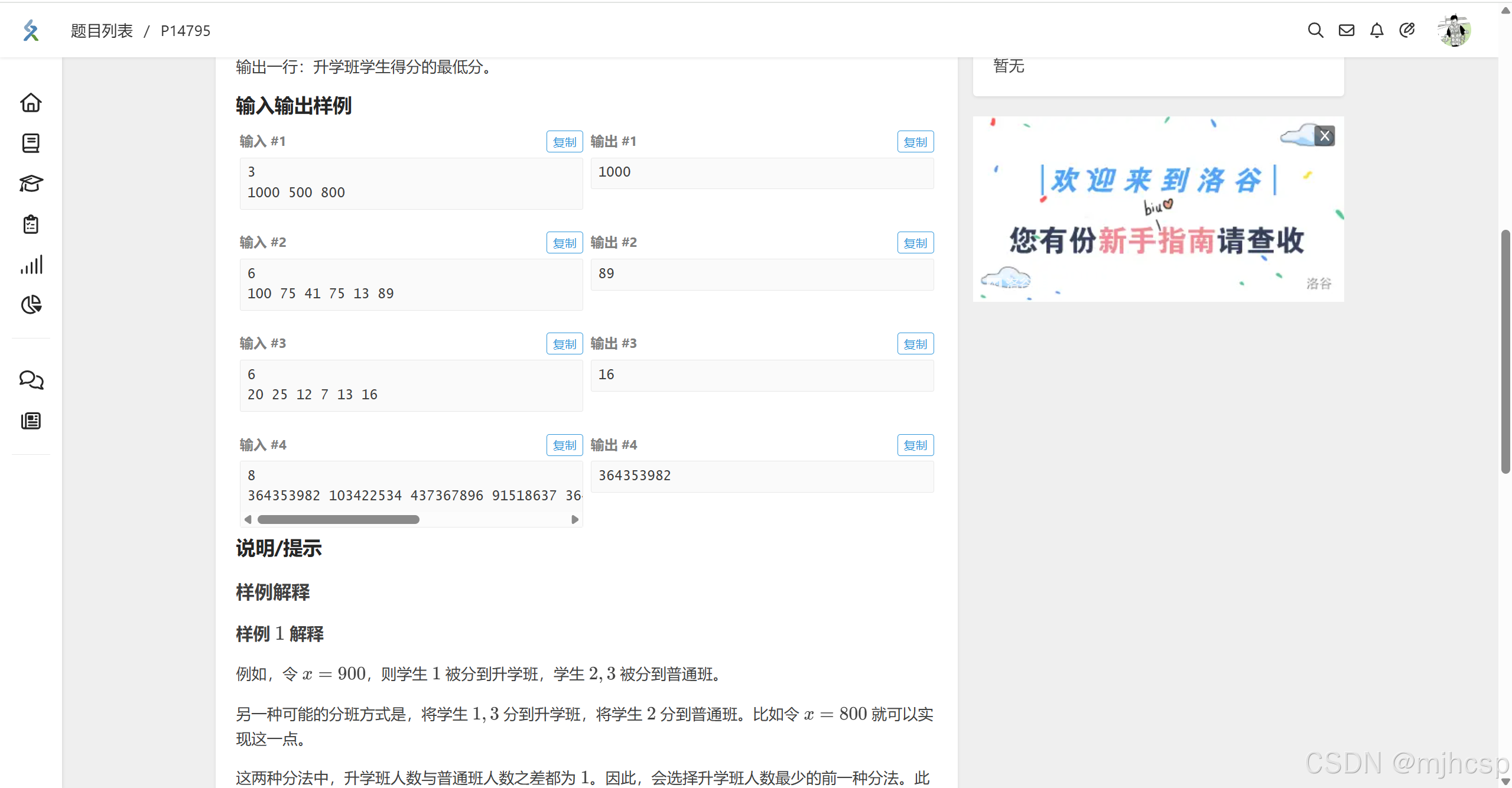 根据这次考试的成绩来决定明年的分班。具体来说,选择一个整数 x x x,将 N N N 名学生分成两个班:得分在 x x x 分以上(含 x x x 分)的学生进入升学班,得分低于 x x x 分的学生进入普通班。
