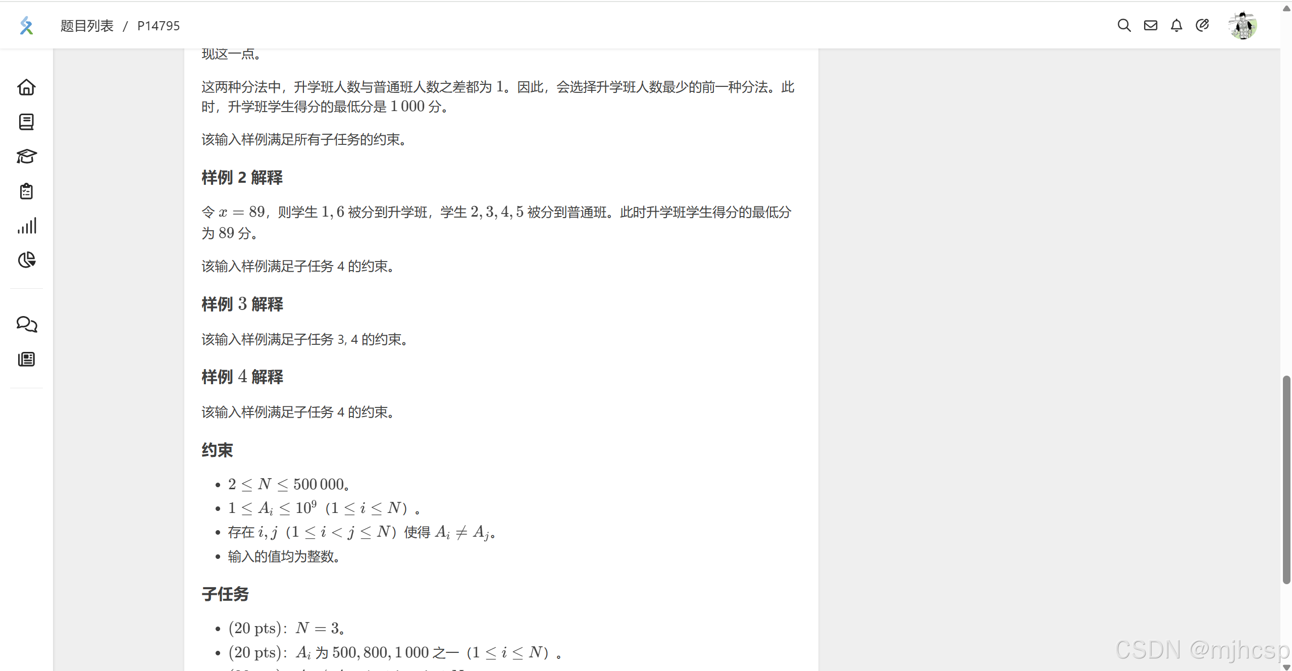 某天,一年级的 N N N 人参加了考试。学生 i i i( 1 ≤ i ≤ N 1 \le i \le N 1≤i≤N)的得分为 A i A_i Ai 分。这里, N N N 人并不是都取得了相同的分数。