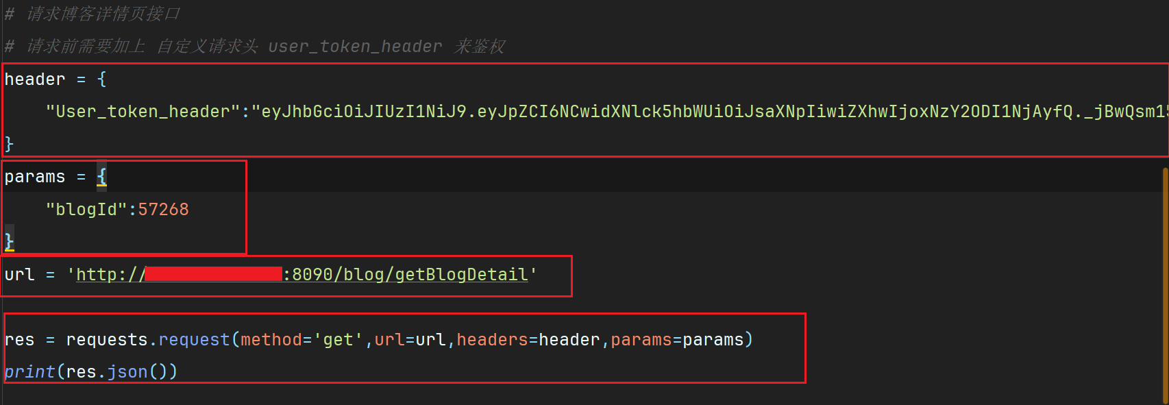 可以看到代码总共是分为了四个部分,分别是header字典,params字典,url路径 , request方法