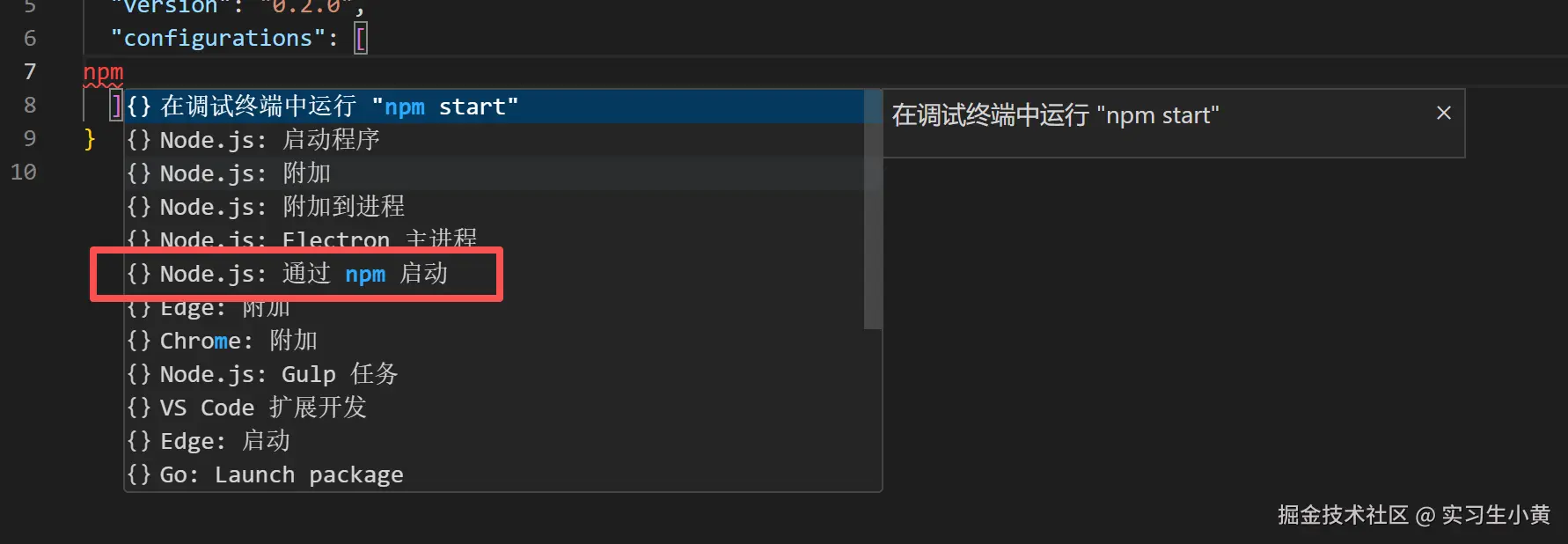 删除 VS Code 自动生成的默认配置,快捷生成 npm node 启动配置项,并且修改相关的 configurations: