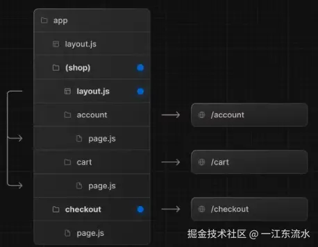 在这个例子中,/account 、/cart、/checkout 都在同一层级。但是 /account和 /cart使用的是 /app/(shop)/layout.js布局和app/layout.js布局,/checkout使用的是 app/layout.js。