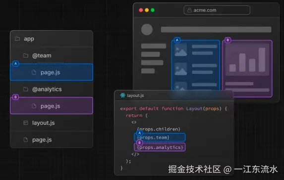 插槽会作为 props 传给共享的父布局。在上图中,app/layout.js 从 props 中获取了 @team 和 @analytics 两个插槽的内容,并将其与 children 并行渲染: