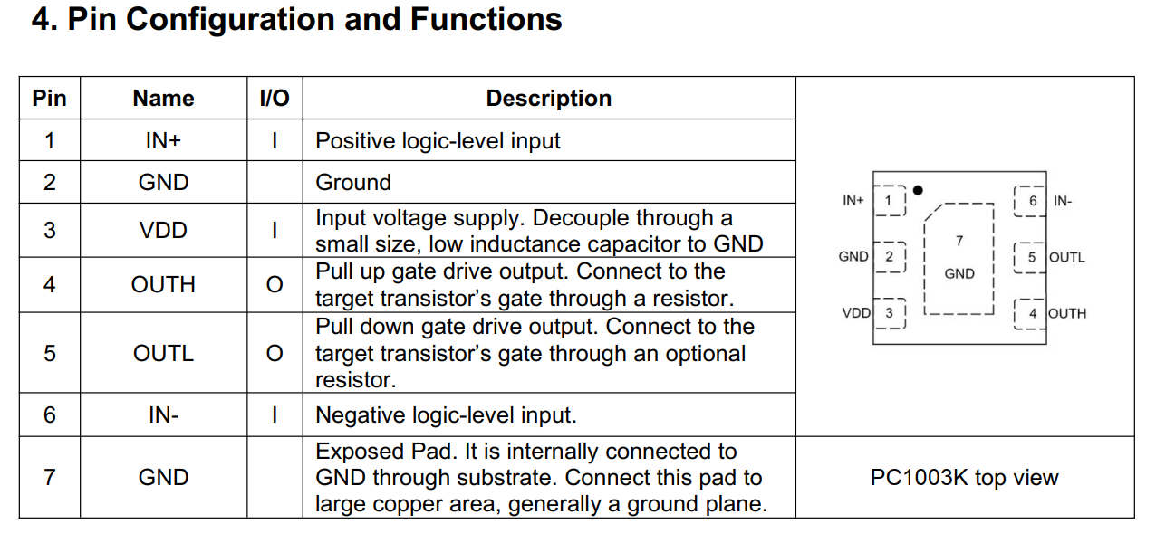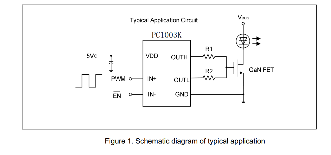 PC1003K器件是一款单通道低端驱动器,专为高速应用中的氮化镓高电子迁移率晶体管(GaN HEMT)驱动而设计(包括激光雷达、飞行时间测距、面部识别以及任何涉及低侧驱动器的电源转换器)。PC1003K设计简洁,可实现极快的传播延迟,仅为2.42纳秒。通过在栅极与OUTH和OUTL之间分别连接外部电阻,可独立调整上升沿和下降沿的驱动强度。该驱动器在过载或故障情况下提供欠压锁定(UVLO),并具备过热保护(OTP)功能。