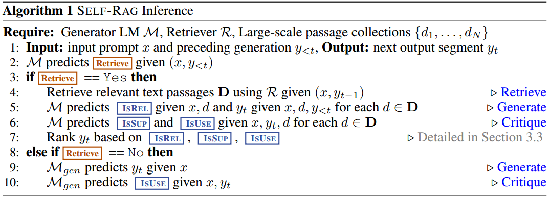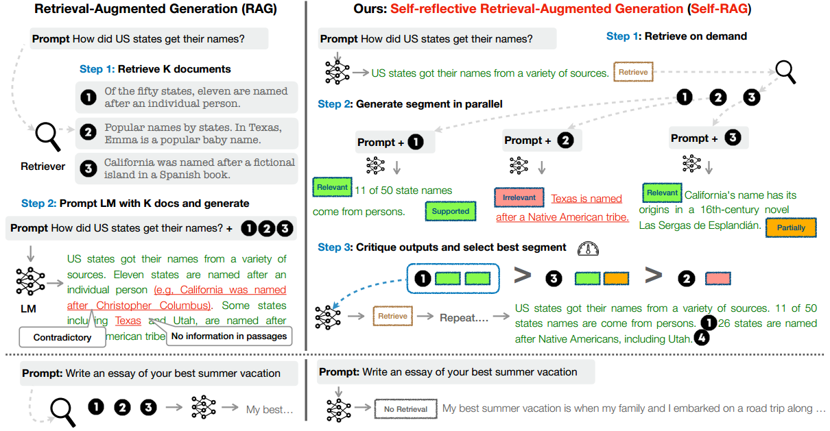 (2)Self-RAG可以按需选择是否检索文档,以及评论自己的生成内容是否准确;