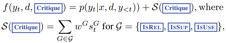 (2)根据评论token,计算各个候选的得分(由基础生成概率和一个评论得分 共同更新,其中评论得分是各类反思 token 归一化概率的线性加权和);