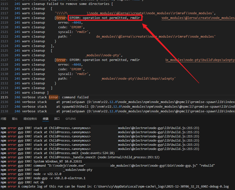 背景 :我在VSCode终端里执行npm install,然后就会报错失败: