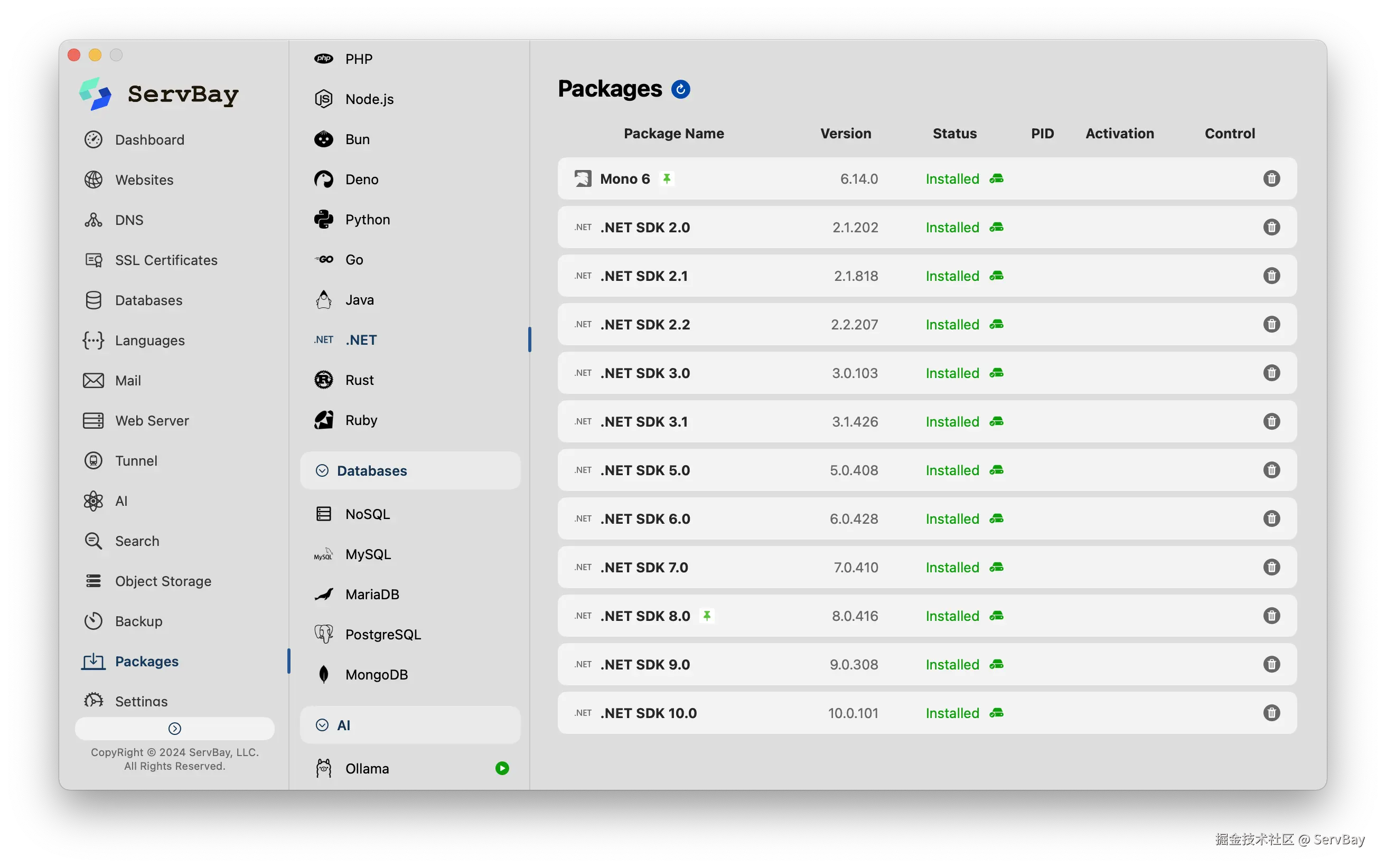 - ServBay 支持从古老的 .NET 2.0 到最新的 .NET 10.0 的安装。而且它还原生支持 Mono 6,这对于维护旧版 Unity 项目、Xamarin 应用或是非标准的 .NET 遗留系统的开发者来说,是一个非常关键的特性。