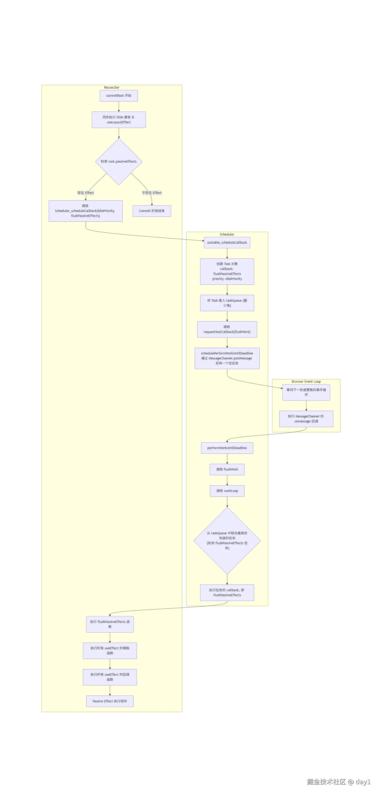 这个"提交 -> 重新调度 -> 异步执行"的闭环,说明passive effect(即 useEffect)正是通过与事件循环(宏任务)的交错执行,才实现了其不阻塞浏览器渲染的异步特性。从 setState 开始的更新,经过 Reconciler 和 Scheduler 的协同工作,最终在 Commit 阶段通过一次新的调度,完成了 useEffect 的异步回调,形成了一个完整的调度模型。
