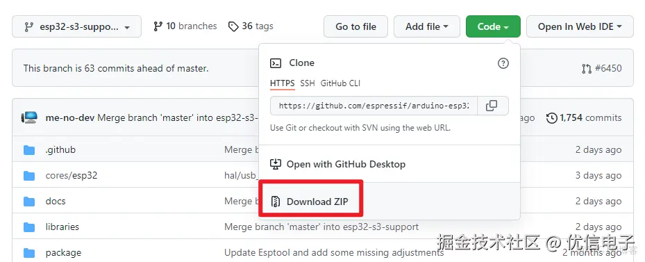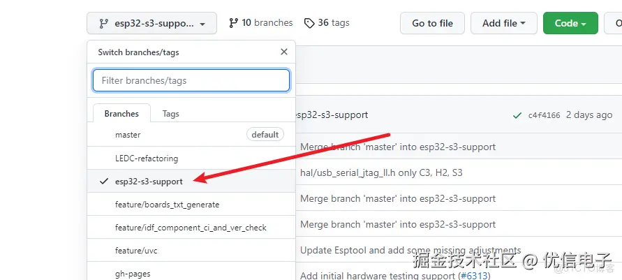 点开进入到乐鑫github,点击 master 位置的箭头可以找到名字为 ESP32-s3-support的分支,打开它,如下图所示