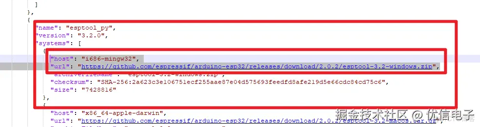 对应的链接在下方的 tools 中,对应 "host": "i686-mingw32" 下方的 url 为我们 windows 下面 arduino 下载的文件链接