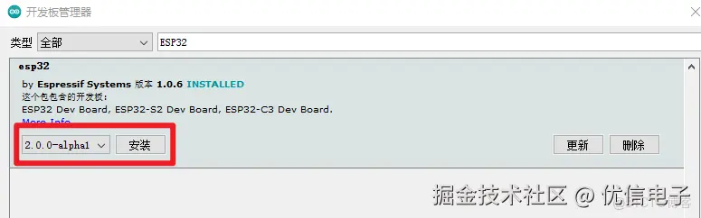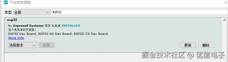 在弹出的界面搜索框输入 ESP32 ,如下图所示(之前安装过旧版本的会显示更新,没安装过会显示为安装)