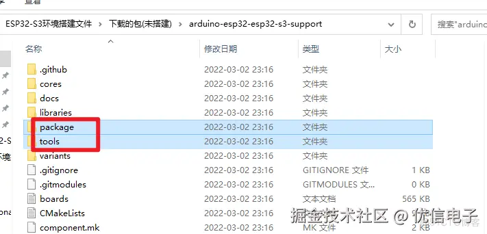 最后修改 文件夹 arduino-esp32-esp32-s3-support 名称为 esp32 ,不然到时候编译的时候会报一个警告