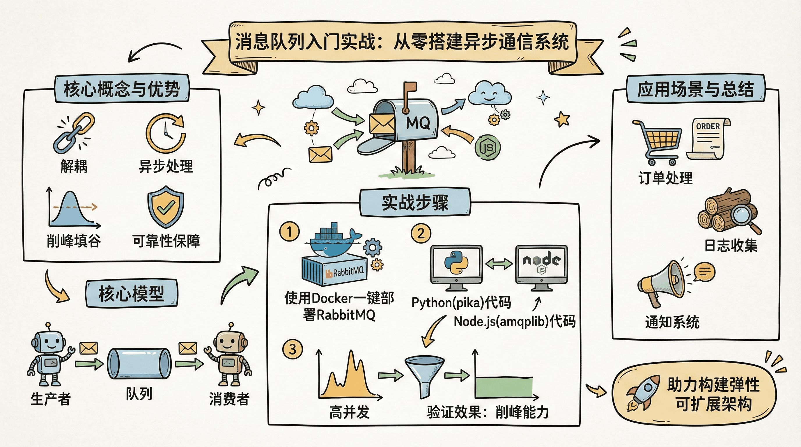 在现代分布式系统中,应用间直接调用常常导致强耦合、性能瓶颈和系统崩溃风险。消息队列作为异步通信的基石技术,能有效解决这些问题。本教程将带你从概念到实践,快速掌握消息队列的核心原理与基础实现,助你构建高可用、可扩展的系统架构。