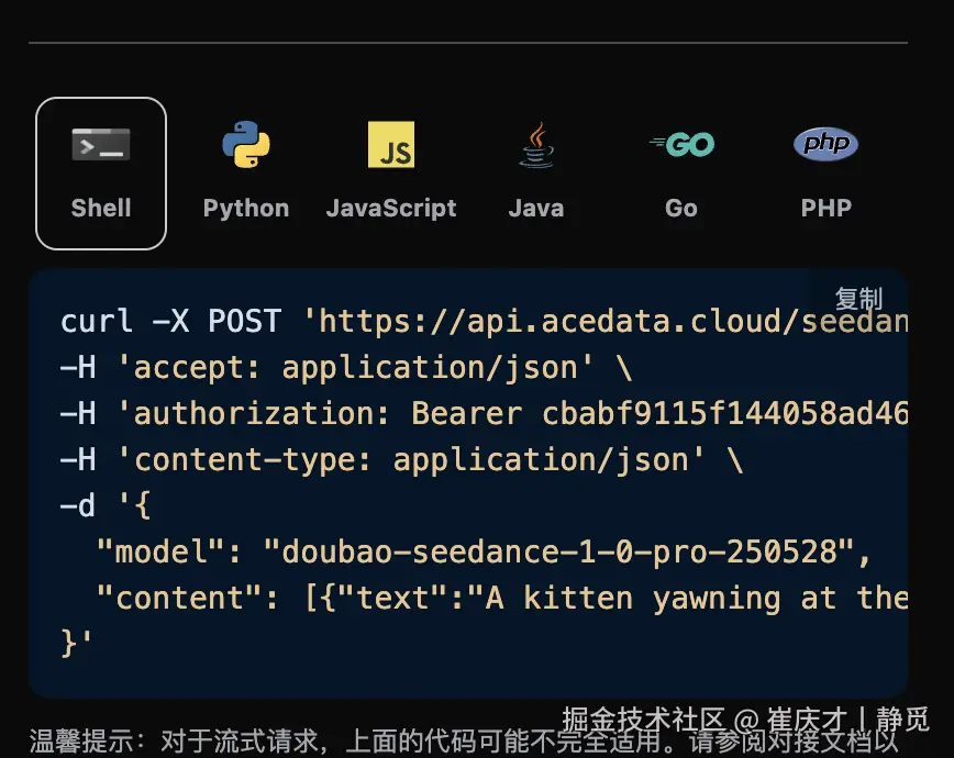 另外如果想生成对应的对接代码,可以直接复制生成,例如 CURL 的代码如下: