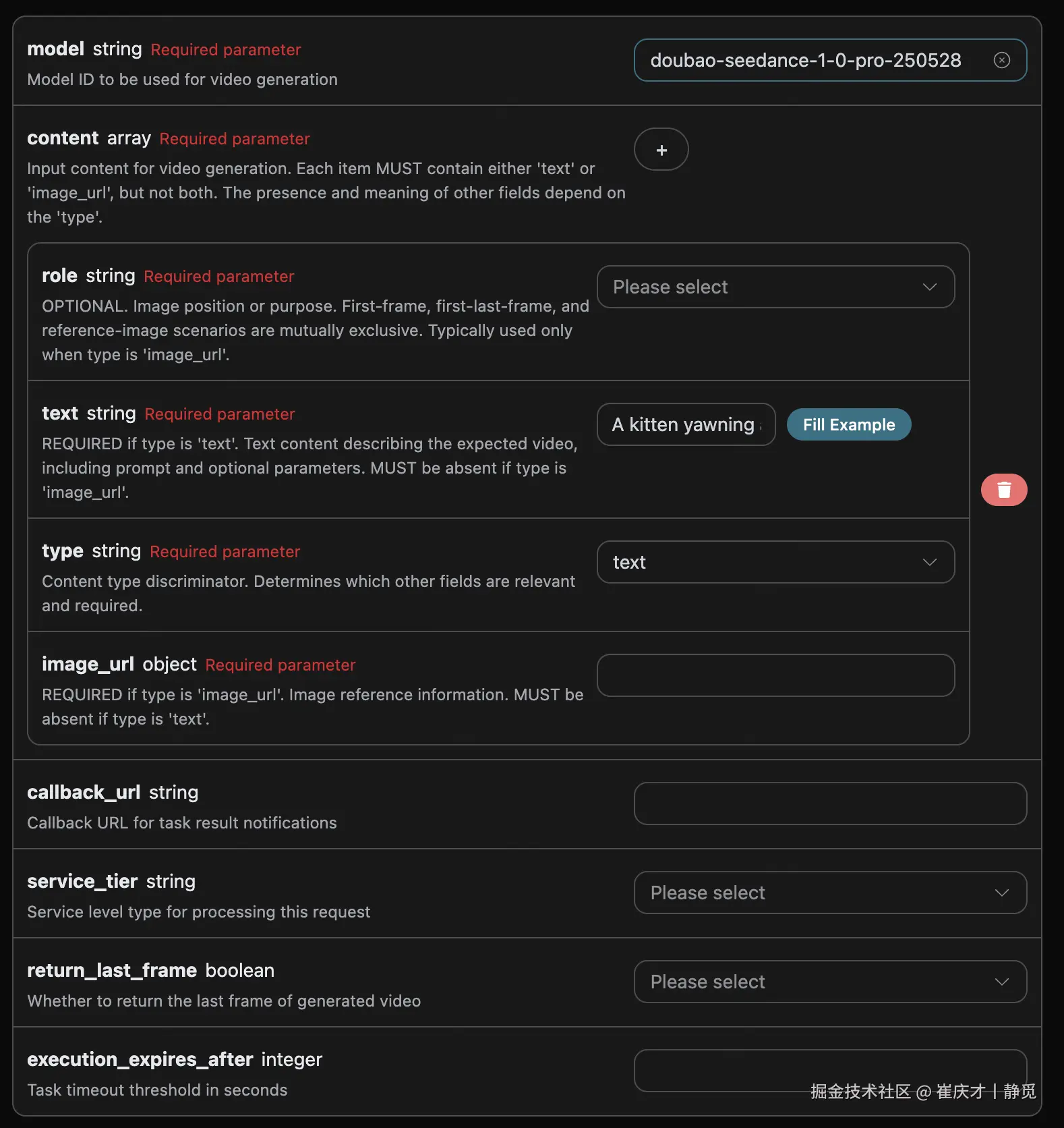 model:生成视频的模型,主要有doubao-seedance-1-0-pro-250528、doubao-seedance-1-0-pro-fast-251015,doubao-seedance-1-5-pro-251215,doubao-seedance-1-0-lite-t2v-250428,doubao-seedance-1-0-lite-i2v-250428context:content的type可以是text,也可以是image_url, image_url支持图片链接和base64数组两种,image_url和text参数互斥。service_tier:有default和flex两种。return_last_frame:是否返回最后一帧execution_expires_after:执行超时时间。callback_url:需要回调结果的URL。
