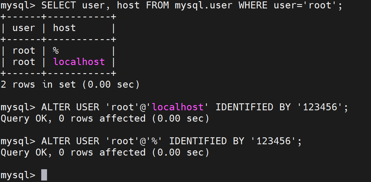 ALTER USER 'root'@'%' IDENTIFIED BY '123456';