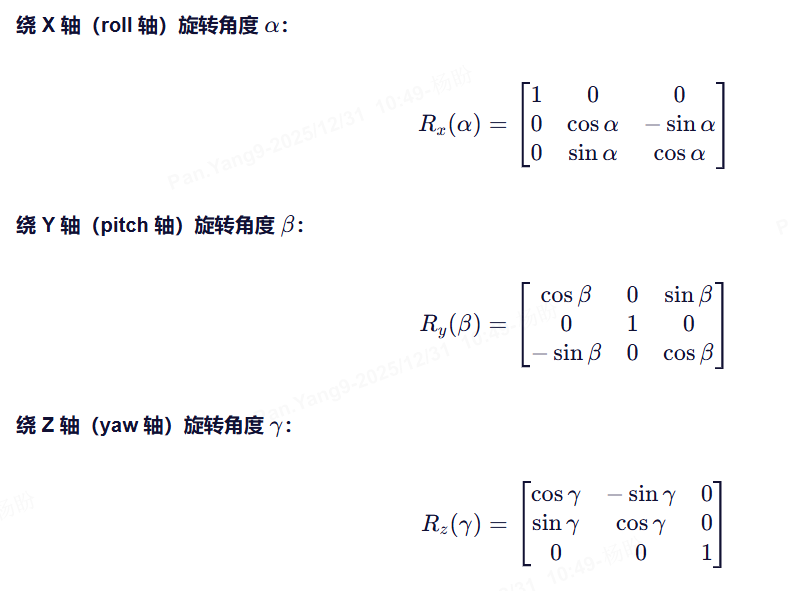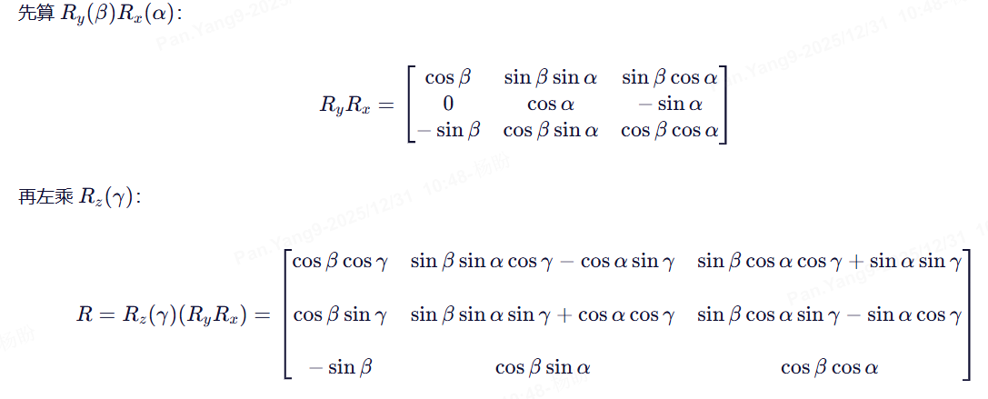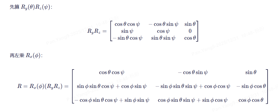则总旋转矩阵为:R=Rx(ψ)⋅Ry(θ)⋅Rz(ϕ)