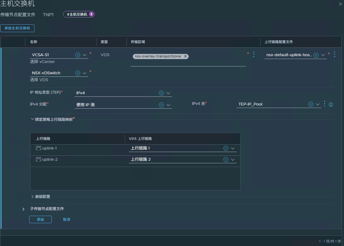 打开NSX 管理界面 > 系统 > Fabric > 主机 > 传输节点配置文件 > 添加