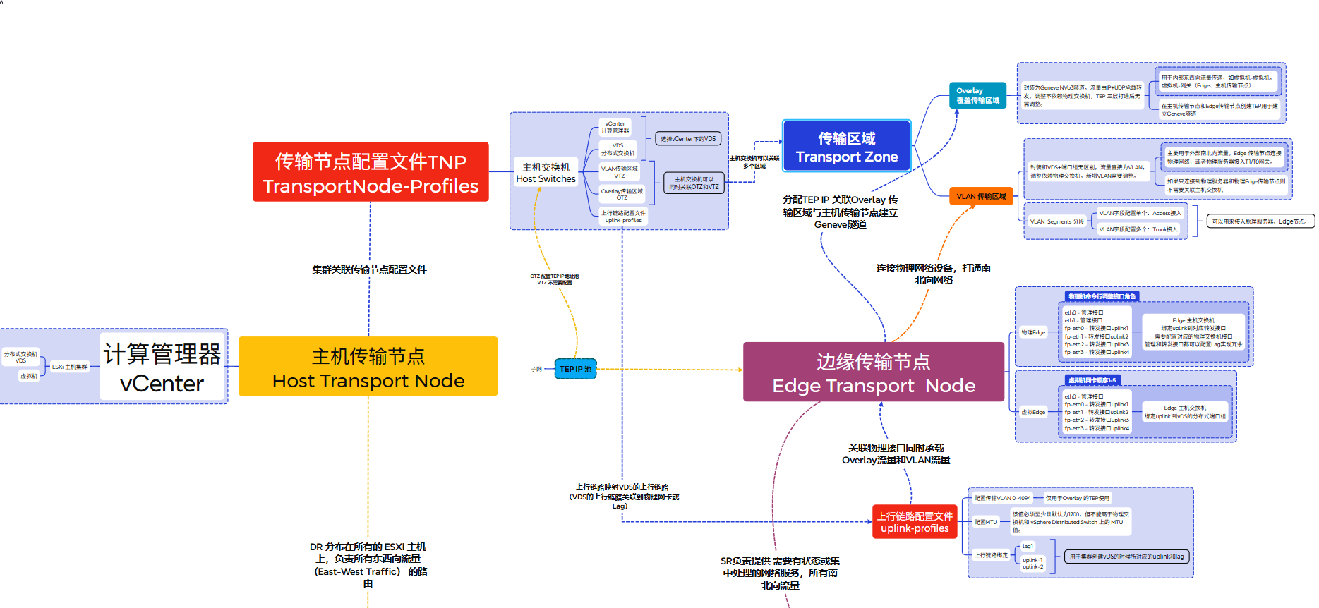 - 组成:通过 NSX Manager 下发配置,结合 vCenter 集群和传输区域(Transport Zone),主机被准备为传输节点。