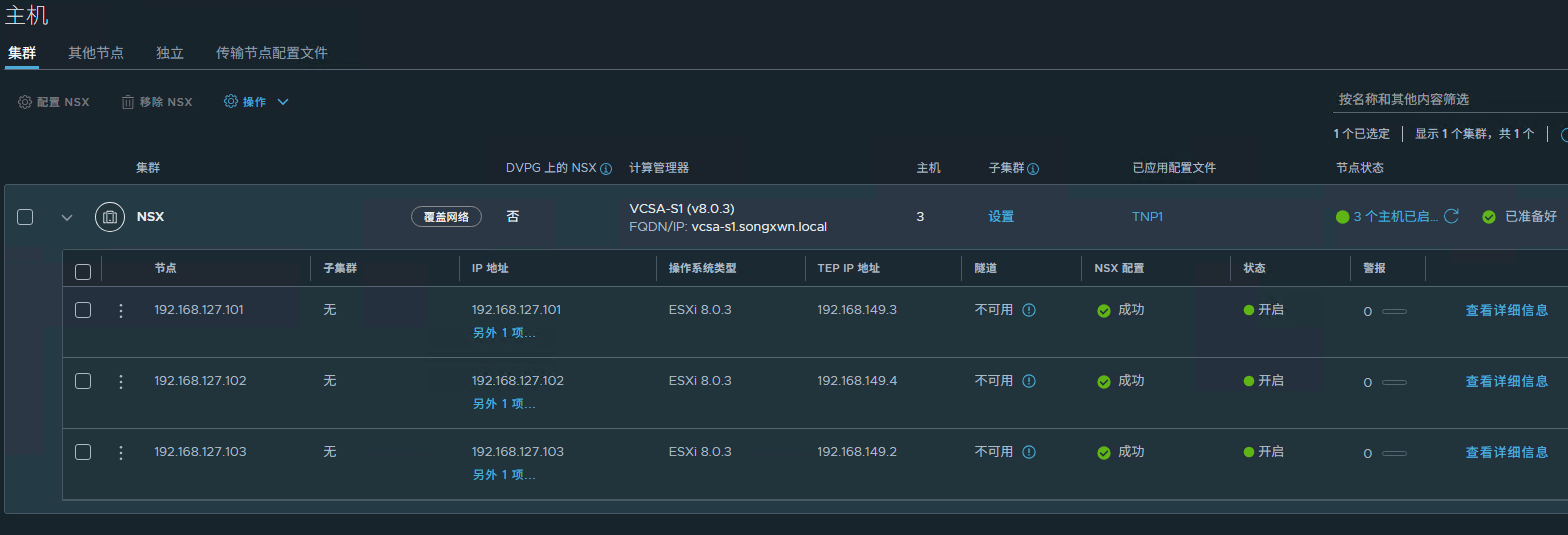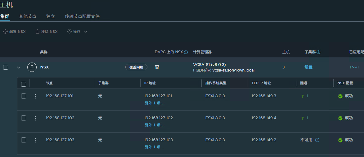 - 自动化配置:在 vCenter 集群中应用传输节点配置文件后,集群内的 ESXi 主机会自动安装 NSX 组件并成为传输节点