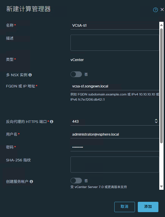 打开NSX 管理界面 > 系统 > Fabric > 计算管理器 > 添加计算管理器