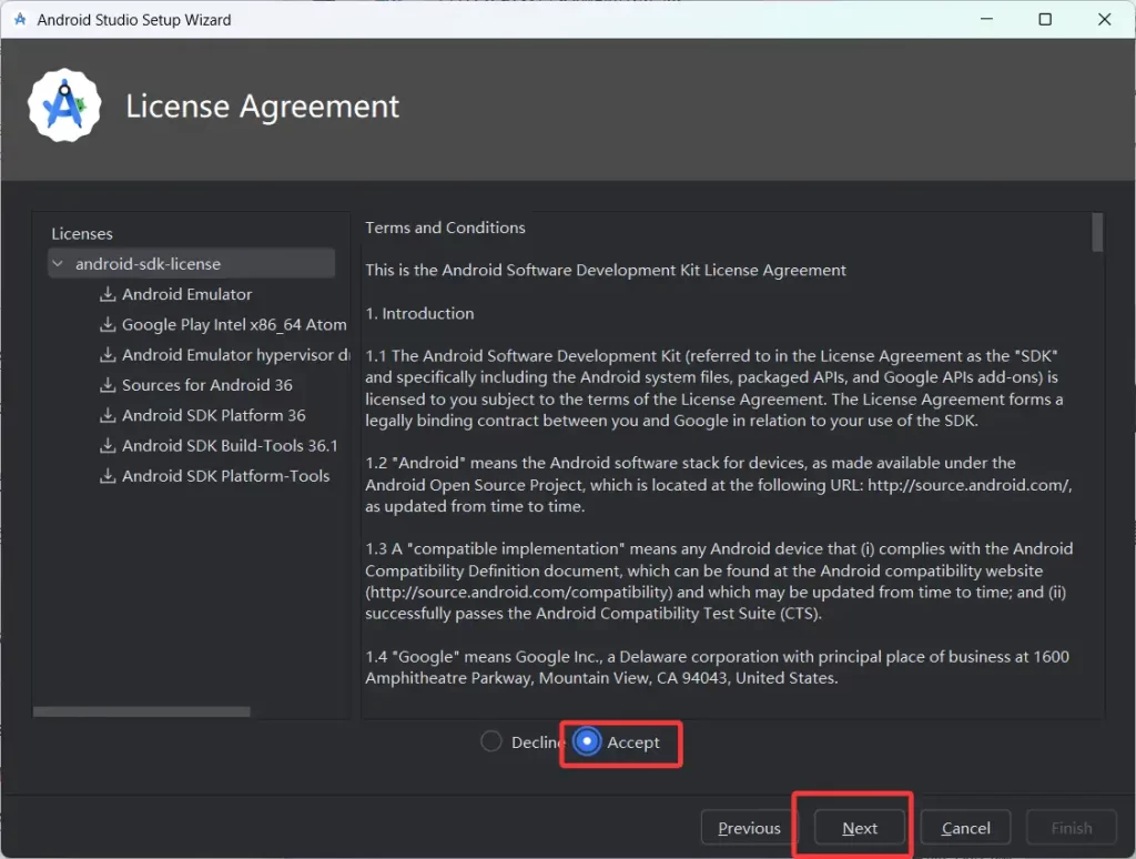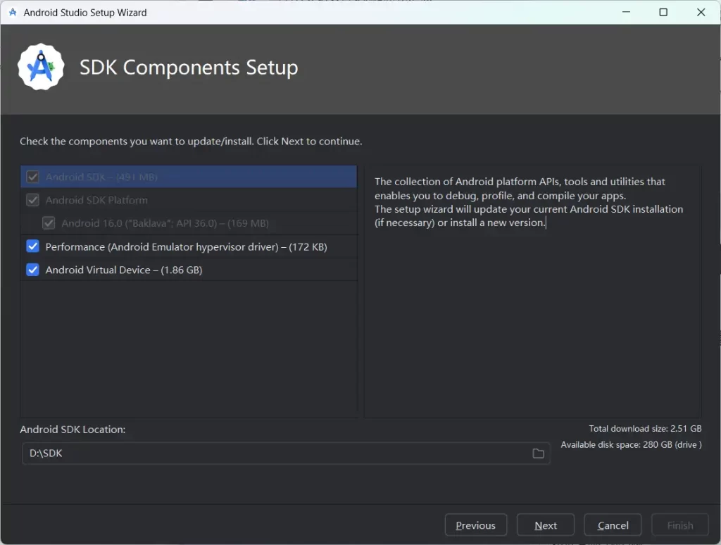 如下图,这里可以自定义SDK的下载路径,默认是C盘,这里我在D盘创建了个空目录用于SDK的下载路径