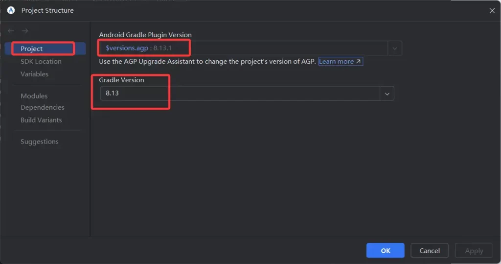 然后最关键的部分来了,我们需要配置Gradle以及Gradle下载依赖的位置,需要注意的是Gradle的版本不是随便选择的,Gradle和APG是具有兼容性,版本不兼容是无法正常运行的,如下图,我们在Projoect Structure中可以看到我们创建的项目AGP为8.13.1,他对应的GradleVersion为8.13,那么我们应该是需要下载Gradle8.13的