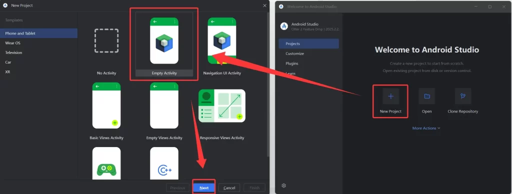 如图,选择NewProject,选择EmptyActivity,点击Next