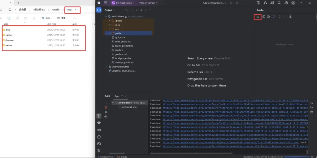 同样的,我们再次点击Gradle的资源下载按钮,并且如图可以看到这里开始正常下载依赖了,而且是下载到了我们配置的repo目录中