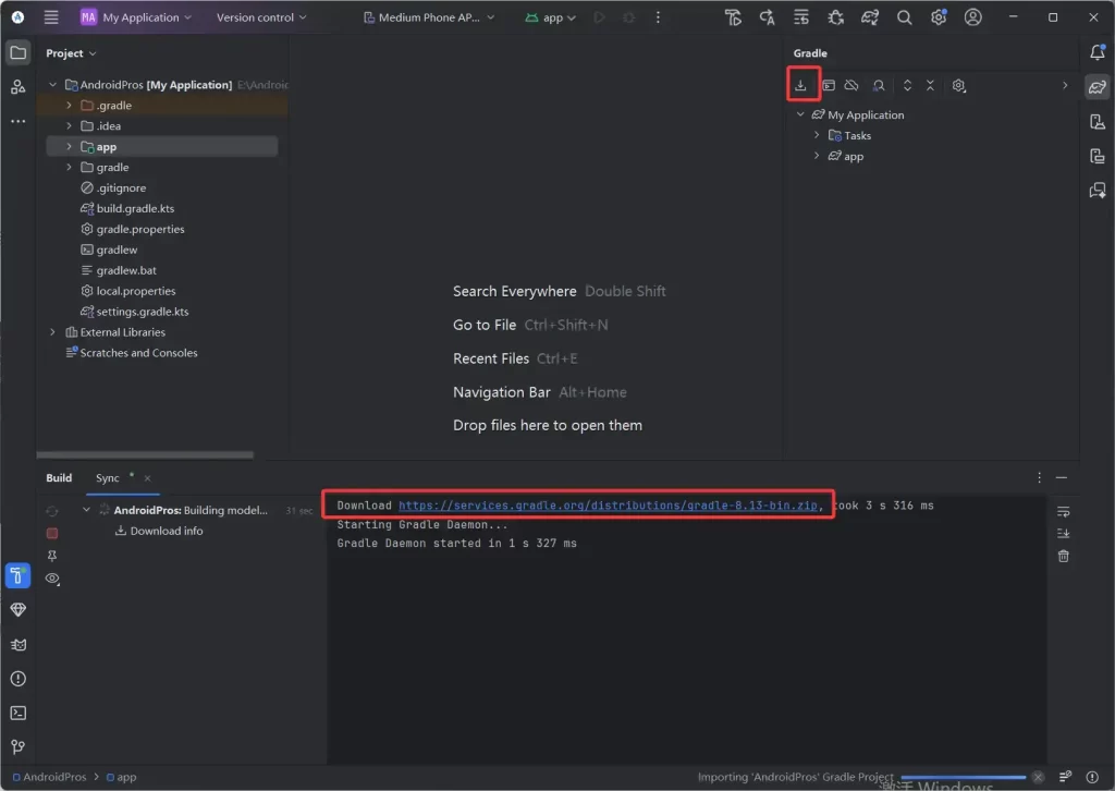 然后我们点击Gradle的资源下载按钮,就会开始自动下载依赖,如图,如果说由于网络原因无法下载,那么我们可以自行通过控制台显示的链接去下载Gradle,如图他这里显示在下载gradle8.13-bin.zip