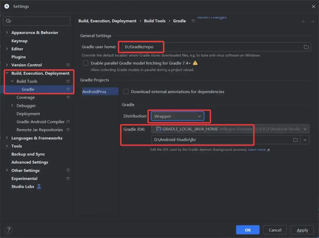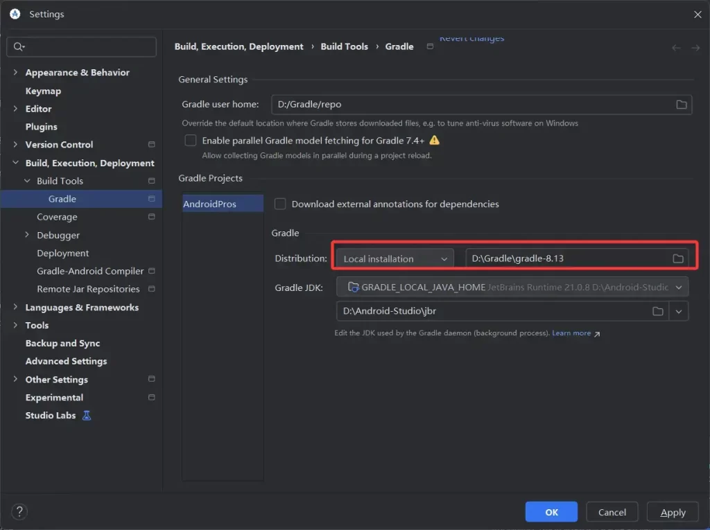 然后,我们回到Settings中修改Gradle配置,将Distribution修改为LocalInstallation,指定本地解压后的Gradle,最后保存
