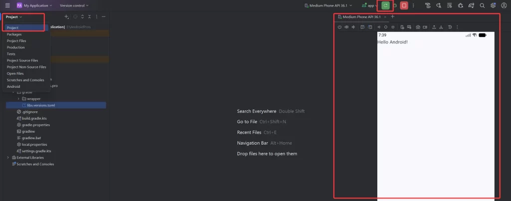 最后,目录列表上可以切换项目的显示方式,幽络源这里倾向于用Project的形式,然后点击绿色运行按钮,如图,程序成功运行